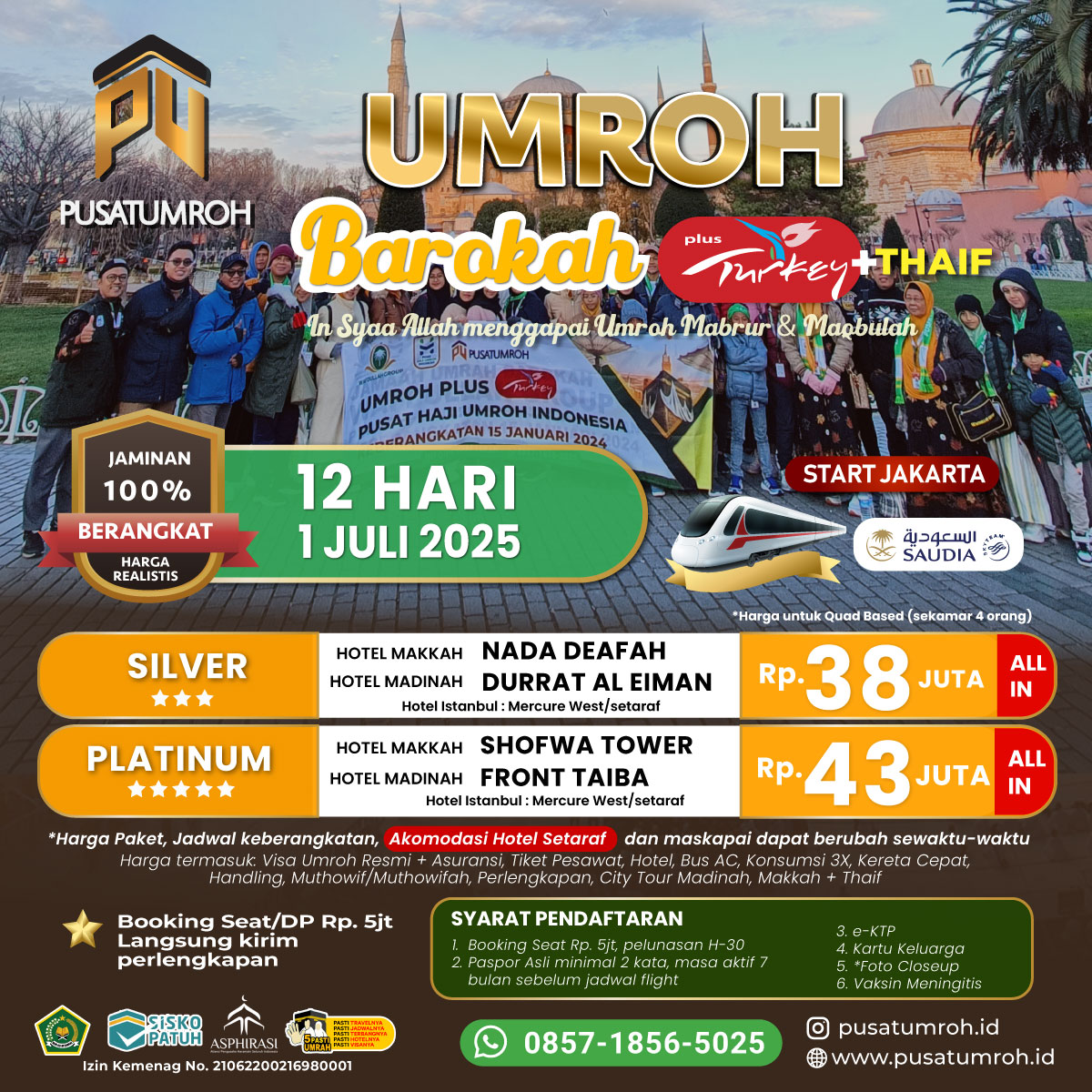 23 Juli 2025 *Ticket Confirmed | Umroh Barokah + Thaif SILVER | 12 Hari 5 Hari Madinah 5 Hari Makkah | Saudi Airlines (direct) | Rp. 33.500.000 (quad) | Info & Pendaftaran |