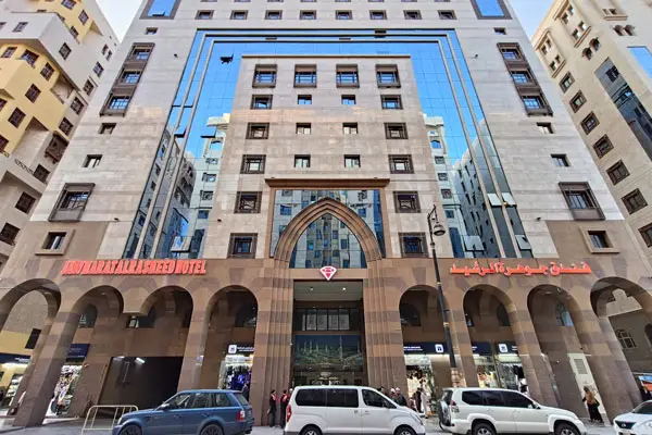 Hotel Jawharat Al Rasheed adalah hotel yang kami gunakan di Madinah untuk paket Super Promo. Hotel dengan grade Bintang 3 berjarak <600 m dengan estimasi jalan kaki <7 menit. Hotel Jawharat Al Rasheed berada persis di depan Gate 310 Masjid Nabawi.